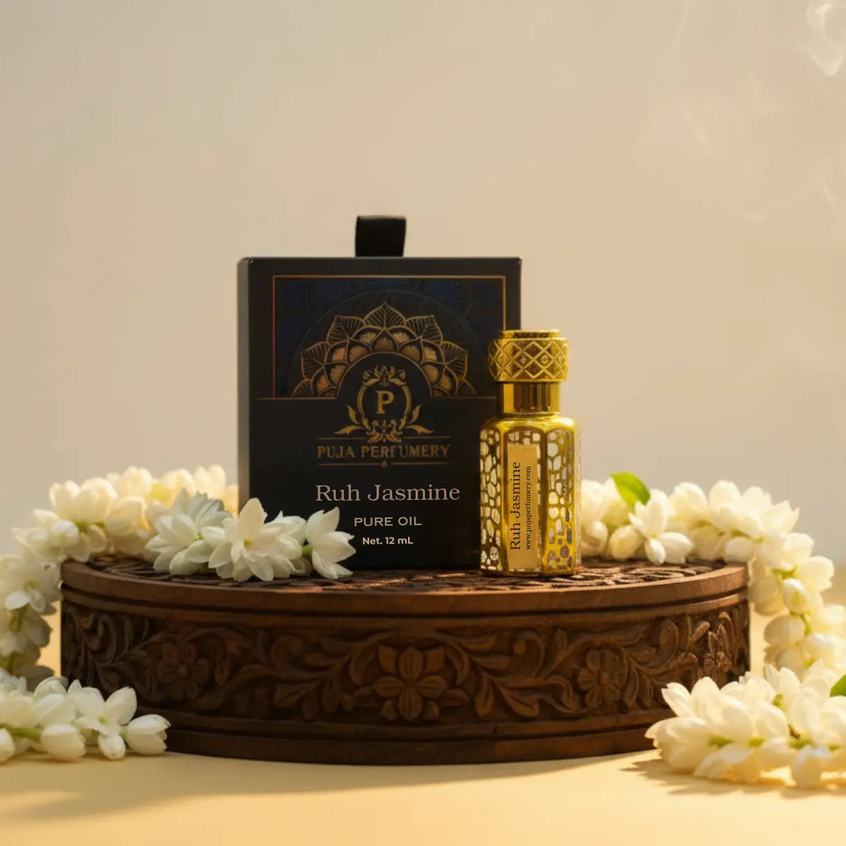 Ruh Jasmine Essential Oil, its scientific name is Jasminum officinale, mostly found in Iran and other topical areas. This essential comes from white Ruh Jasmine (Bela) flower plants. This flower is well-known for its sweet and romantic fragrance that helps to improve our mood. Now-a-days, popular perfume brands use jasmine essential oil to enhance the effectiveness of their products. In addition, jasmine oil is also used in alcohol, desserts and sweets. You can get the best quality of Ruh Jasmine Essential Oil only on Puja Perfumery.